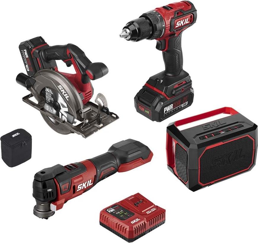 The Ultimate 20V Tool Combo Kit. This tool combo kit includes the following PWR CORE 20™products: Drill Driver, Reciprocating Saw, Oscillating Multi Tool, Bluetooth Speaker, Sander, and Spotlight. Includes the power and performance of the SKIL 4.0Ah PWR CORE 20™ Lithium Battery with PWR ASSIST™ Mobile Charging, 2.0Ah PWR CORE 20™ Lithium Battery with PWR ASSIST™ Mobile Charging, and PWR JUMP™ Charger.