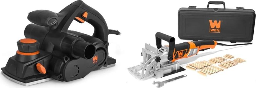 WEN 6534 8-Amp Electric Hand Planer, 4-3/8-Inch Remember when you needed to smooth out those joists? Plane away chips, splinters, and misshapen edges with the WEN 8-Amp 4-3/8 Inch Electric Hand Planer. Take on 2x4s and 4x4s with the spacious 4-3/8-inch cutterhead. Perfect for fixing stubborn doors and fitting wood. This power planer’s 8-amp motor delivers over 32,000 cuts per minute to your workpiece, slicing away any irregularities until the surface of your boards are aligned and smooth. With a cutting width of 4-3/8 inches and a maximum cutting depth of 1/8 of an inch, you’ll have the perfect companion for fitting and squaring boards. The 16 positive stops go from 0 all the way up to 1/8 of an inch in 1/128 inch intervals. The base plate shoe even includes two v-shaped chamfer grooves for easily flattening sharp post corners. The onboard kickstand protects both the blade and the workpiece by keeping the blade elevated and out of contact from the surface of your project in-between cuts. Finally, the dust adapter combined with the two-way dust port helps users manage loose shavings, keeping your work space clean and sawdust free. The included rabbeting guide helps create rabbets in your boards while the parallel fence bracket keeps your planer traveling perfectly straight. And because this is a WEN Product, your 8-Amp 4-3/8-Inch Corded Hand Planer comes backed by a two-year warranty, a friendly customer help line, and a nationwide network of skilled service technicians. Remember when you had a reliable planer that lasted for years? Remember WEN. WEN JN8504 8.5-Amp Plate and Biscuit Joiner with Case and Biscuits Remember when your boards aligned perfectly? Create joints of all shapes and sizes with a WEN Plate and Biscuit Joiner. Pre-set stops easily create slots for standard #0, #10, and #20 biscuits, or can be manually adjusted for biscuits of more unique sizes. The included fence can be set between 0 to 90 degrees with variable height settings to accommodate projects of all shapes and sizes. The powerful 8.5-amp motor rotates the included 4-inch carbide-tipped blade at 10,000 RPM, making easy work out of even the hardest of woods. This kit also includes a detachable dust bag, 24 #20 wood biscuits, 16 #10 wood biscuits, 10 #0 wood biscuits, and a blow mold carrying case. Perfect for edge miter joints, corner joints, T joints, offset joints, frame joints, edge-to-edge joints, and more. And because its a WEN product. a friendly customer help line, and a stocked inventory of replacement parts, all to make sure you remember WEN.