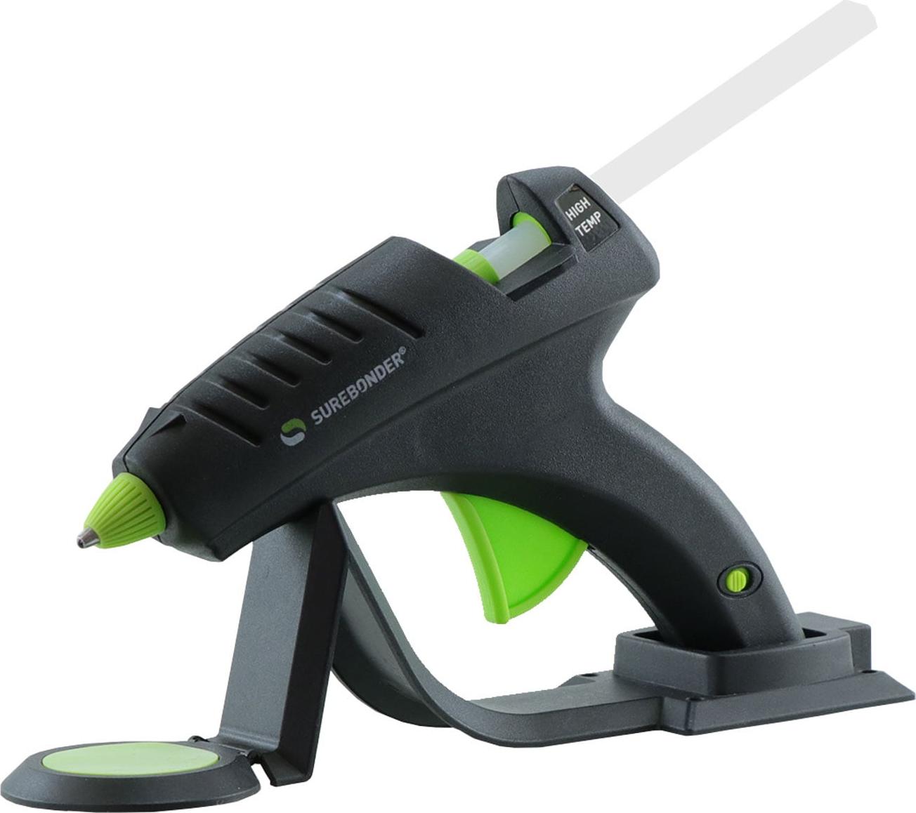 Surebonder high-temperature black/green cordless full-size glue gun. This 60-watt high-temperature cordless glue gun is great for smaller projects along with some DIY applications. The full-sized glue gun reaches a high temperature which allows for better bonding with porous and non-porous materials. It includes a charging stand with a mini glue pad. Use the glue gun as a corded version by removing the cord from the charging stand and plugging it into the bottom of the glue gun handle.