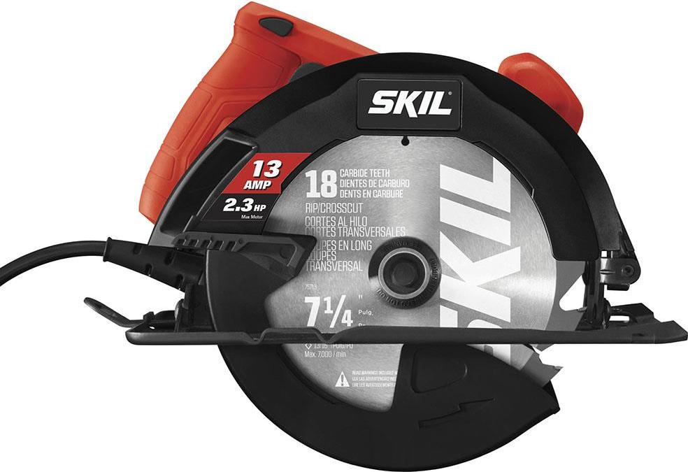 From cutting shelving to mitering trim, the SKIL 5080 7-1/4-inch corded circular saw is a great entry-level saw for the home workshop. The 13 amp motor has the power and performance that you need, and the improved dust blower keeps line of cut free from sawdust for accurate cuts. An adjustable bevel up to 51 degrees, with positive stop at 45 degrees, let's you make a wider variety of cuts. Blade changes are easy with the spindle lock and blade wrench stored on tool. The 5080 includes an 18 tooth carbide blade.