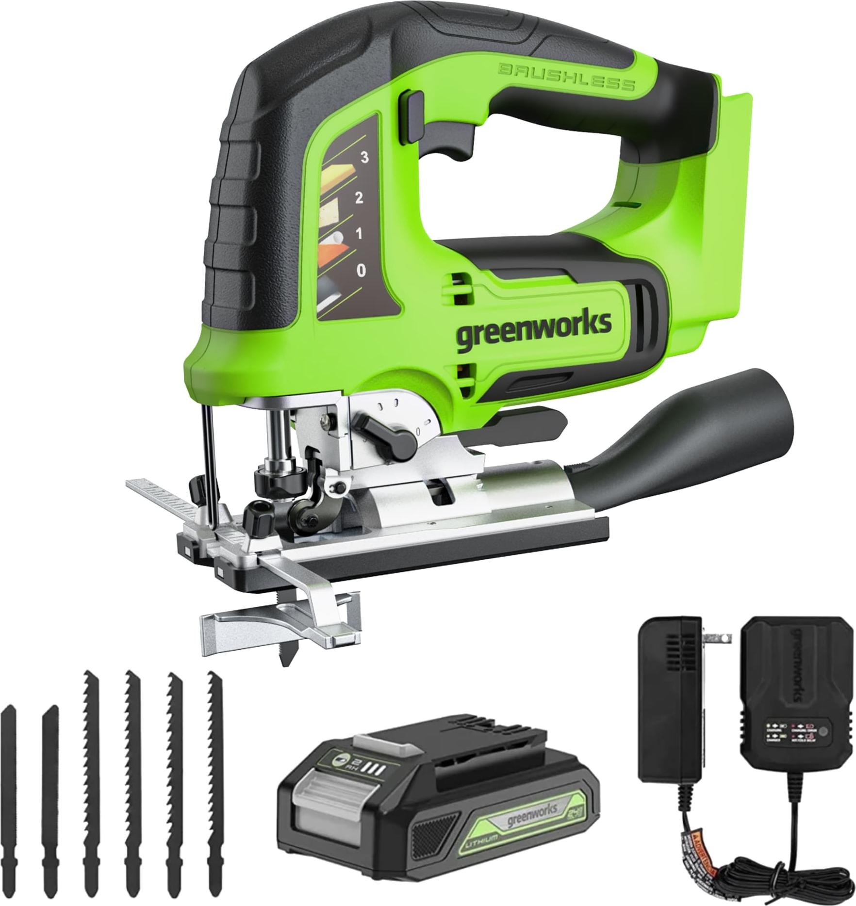 New Greenworks 24V Cordless Brushless Jig Saw: Powerful & Durable: Greenworks 24V lithium-ion battery delivers more power and longer runtime than most other 20V and 18V tools. The high-performance brushless motor provides more torque and extended life 4 Orbital Setting: Adjusts cutting speed and aggressiveness for wide use of the jig saw. Shoe bevel with detents at 0°, 15°, 30° and 50° for easy adjustment Tool-free Quick Clamp allows for easy blade change Built-in LED Light illuminates poorly lit surfaces Included dust connector can be connected to a vacuum to keep a clean working environment Variable Speed Trigger (0-3000 SPM): Provides control for accurate and clean cuts in different applications 1" Blade stroke for cutting wood, metal and more materials
