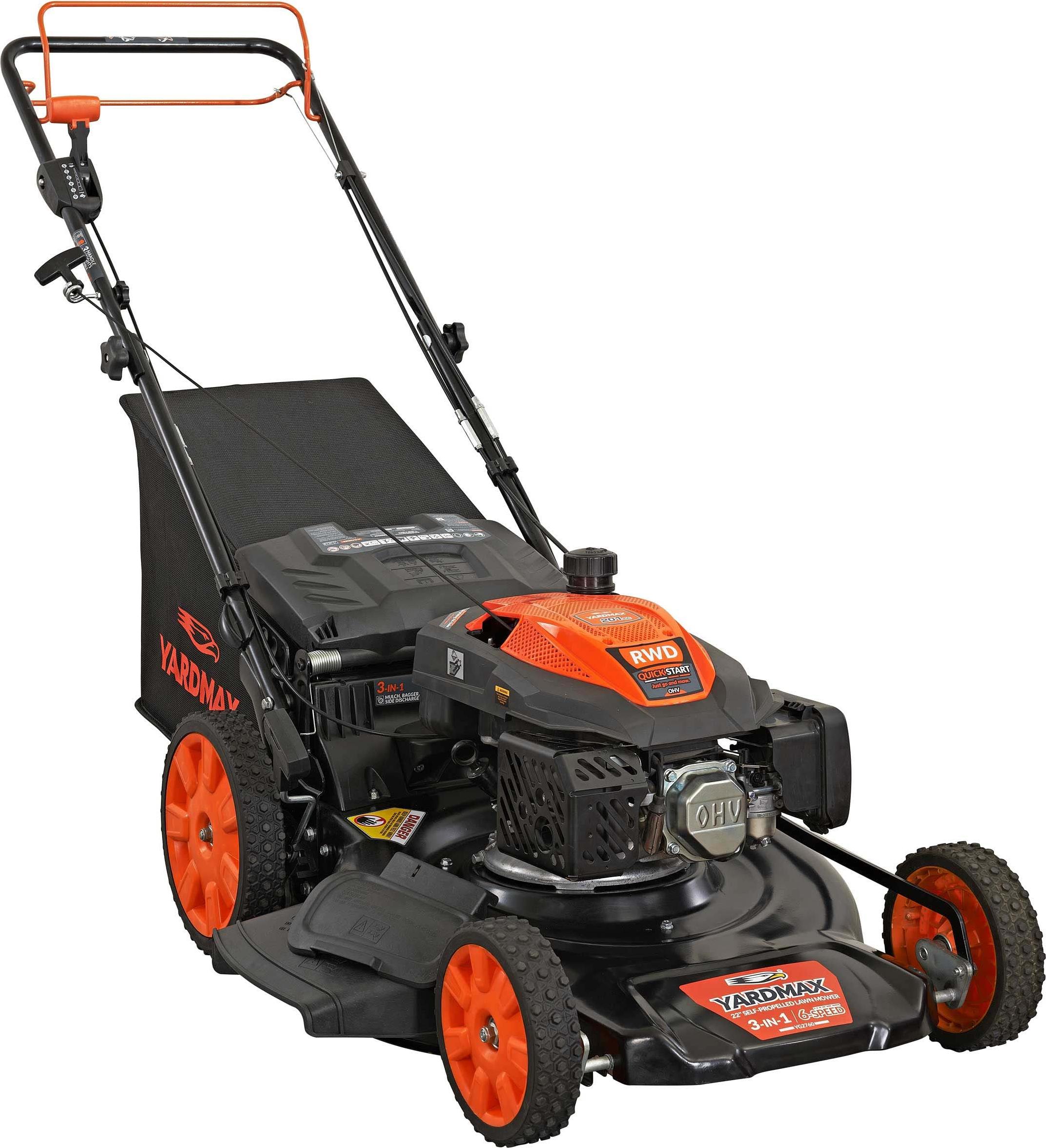 The YARDMAX 22" 3-in-1 rear wheel drive (RWD) Self Propelled Lawn Mower features mulching, side discharge and rear bagging options for disposing of grass clippings. Equipped with a durable 201cc OHV YARDMAX engine with automatic choke system for an easy start, it will give you an efficient and powerful performance with no priming or choking required. This mower features exclusive and industry leading continuously variable transmission (CVT) offering superior speed variability which allows you to mow at a suitable and comfortable pace, adapting to your walking speed. Cut the lawn to your specifications with seven cutting positions from 1.38" to 3.55”, using a convenient single lever. The 8-in. front wheels and 11-in rear wheels offer smooth rolling and reduced vibration. All wheels are equipped with double ball bearings and exclusive aggressive spiked tread rubber tires for an increased traction and maneuverability. The MaxFlow volute deck is designed to keep grass clippings airborne longer for superior mulching, or for flowing into the rear bag when needed. The mower also features a durable and strong single-piece, seamless stamped steel deck made of 16-gauge steel. Convenient way to quickly clean the underside of the cutting deck with the deck cleanout port, simply attach a hose to the port. Space saver, the entire mower can be compactly folded for storing in limited garage spaces. Fully assembled, just unfold the handle and you’re ready to go. The YARDMAX YG2760 will make your yardwork job easy and will provide reliable performance and clean-even cut season after season.