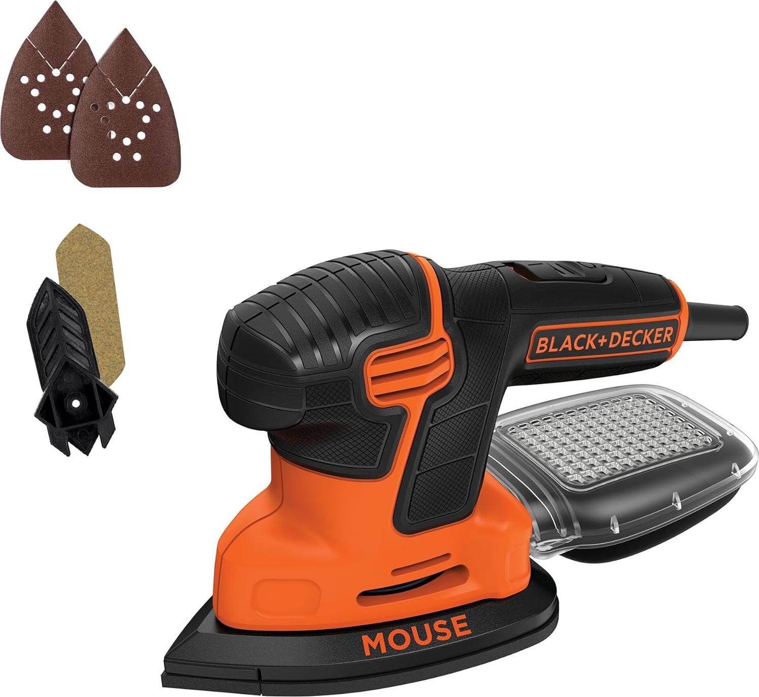 The Black & Decker BDEMS600 Mouse Detail Sander features a 3-position grip for control and ease of use in multiple applications. The palm grip is ideal for sanding surfaces. The precision grip provides extreme maneuverability, and the handle grip allows you to get into ultra-tight spaces. It offers high performance dust collection with micro-filtration for a clean workspace, along with a see-through dust canister to help let you know when it's full. Its compact size and ergonomic design allows you to finish intricate projects and maximizes user control.